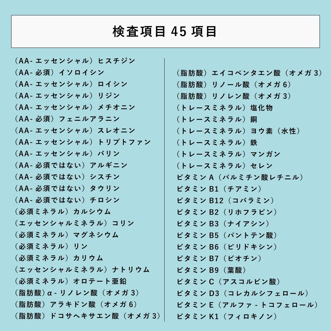 検査項目詳細 ビタミン13種類、ミネラル13種類(必須、エッセンシャル、トレース)、脂肪酸6種類、アミノ酸13種類